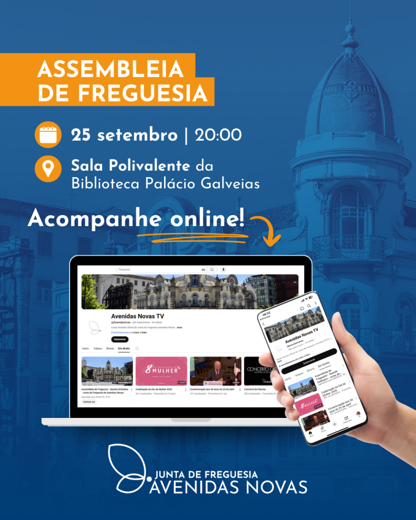A Junta de Freguesia de Avenidas Novas informa que a próxima Assembleia de Freguesia, a realizar no dia 25 de setembro (quinta-feira), às 20h, na Sala Polivalente da Biblioteca Palácio Galveias (Campo Pequeno, 1049-046 Lisboa), terá transmissão em online, em direto, no nosso canal de YouTube!