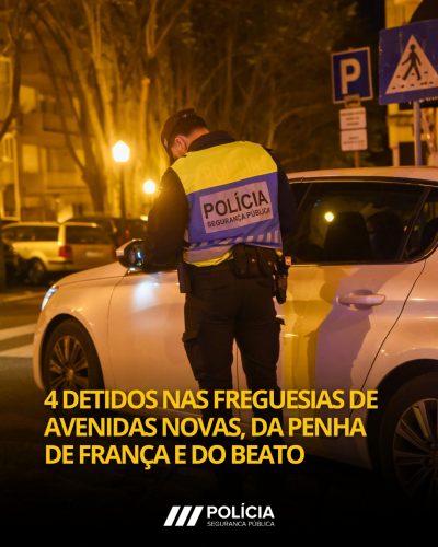 No âmbito da atividade operacional da 5.ª Divisão Policial, foram realizadas várias detenções em diferentes freguesias de Lisboa, incluindo duas ocorrências na área de Avenidas Novas, relacionadas com a condução de veículos em estado de embriaguez.