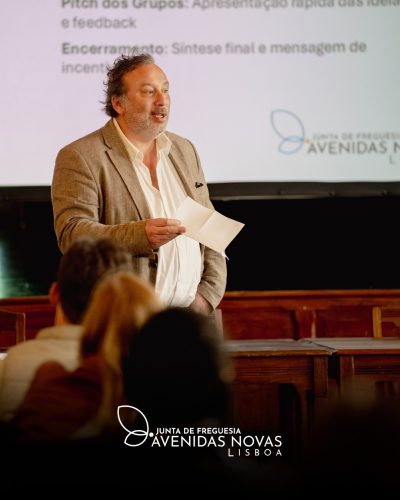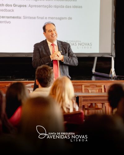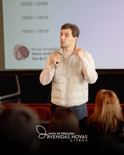 A sessão contou também com a intervenção do Vogal da Junta de Freguesia de Avenidas Novas, Nuno Möller, que deu as boas-vindas aos alunos e partilhou uma palavra sobre a importância do empreendedorismo, destacando o esforço, a resiliência e a determinação como pilares fundamentais para alcançar o sucesso.