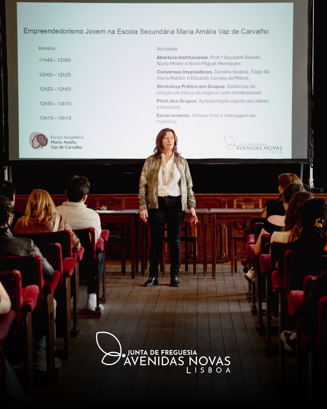 A sessão contou também com a intervenção do Vogal da Junta de Freguesia de Avenidas Novas, Nuno Möller, que deu as boas-vindas aos alunos e partilhou uma palavra sobre a importância do empreendedorismo, destacando o esforço, a resiliência e a determinação como pilares fundamentais para alcançar o sucesso.
