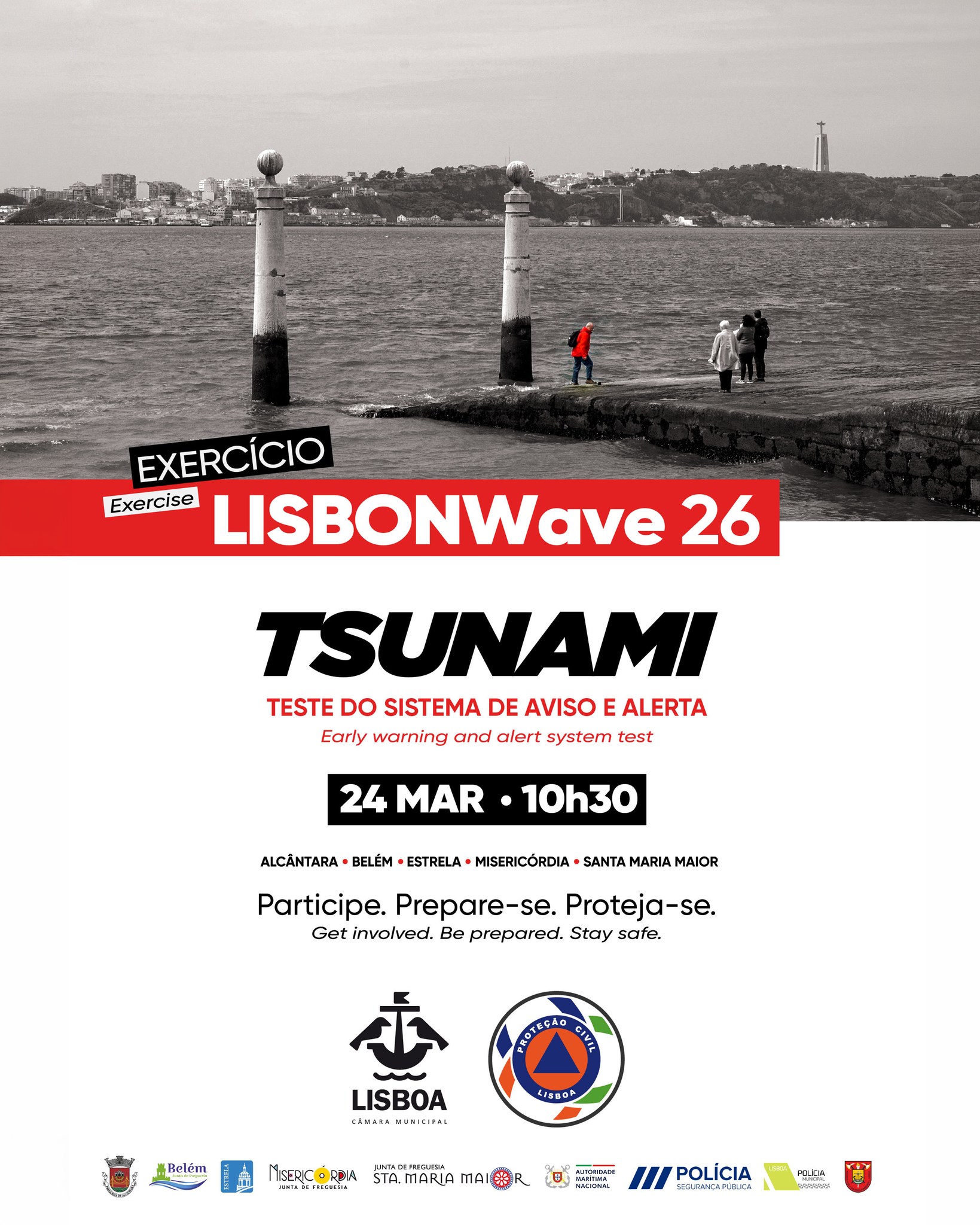 A pedido do Serviço Municipal de Proteção Civil da Câmara Municipal de Lisboa, divulgamos a realização do exercício LISBONWave 26, que terá lugar no próximo dia 24 de março, pelas 10.30 horas, na Praça do Comércio.