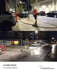 A equipa de Higiene Urbana da Junta de Freguesia das Avenidas Novas realizou, durante a madrugada de hoje, intervenções de lavagem na Rua Sanches Coelho.