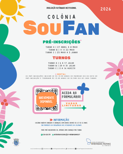 A Junta de Freguesia de Avenidas Novas – Lisboa informa que irão abrir as pré-inscrições para a Colónia Soufan 2026, destinada a crianças com idades compreendidas entre os 6 e os 12 anos.